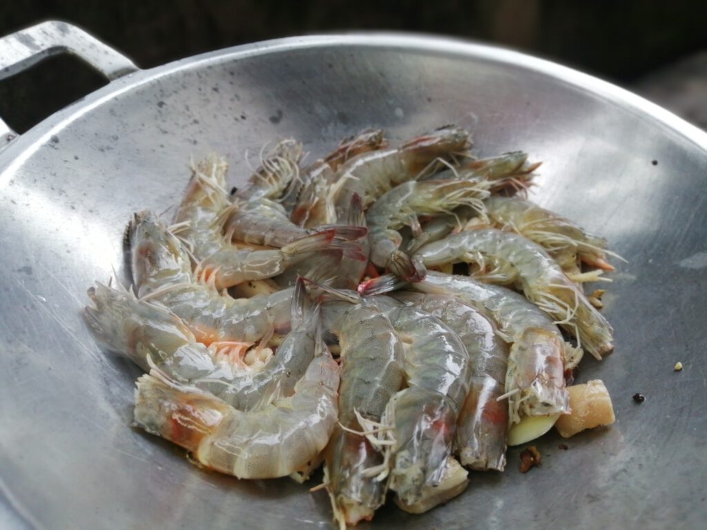 7.เมื่อเครื่องเริ่มส่งกลิ่นหอมแล้ว ให้เปลี่ยนมาใช้ไ ฟอ่อน และใส่กุ้งที่เราทำความสะอาดเรียบร้อยแล้ว ลงไป