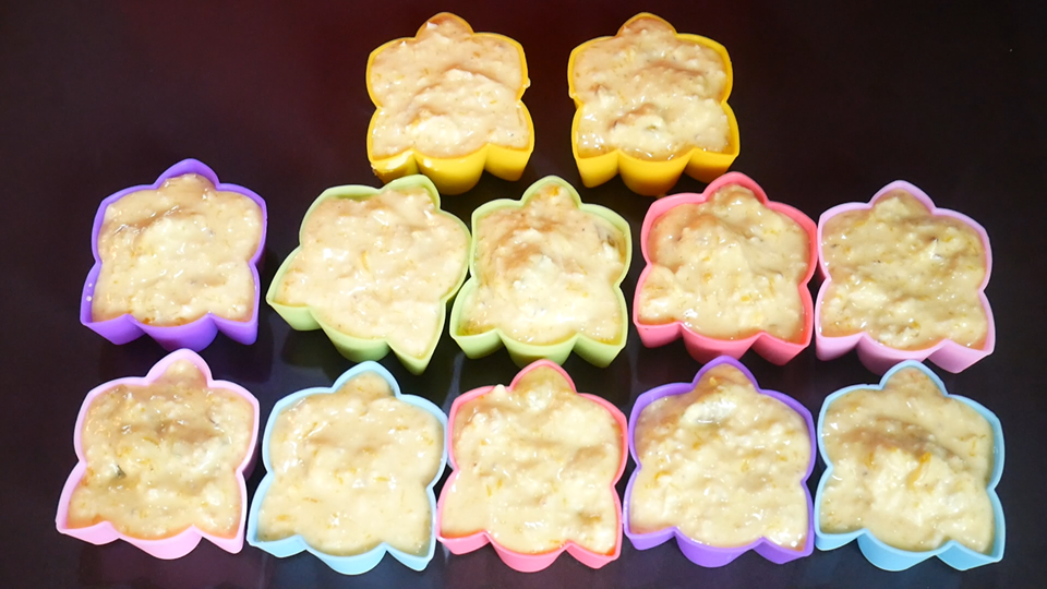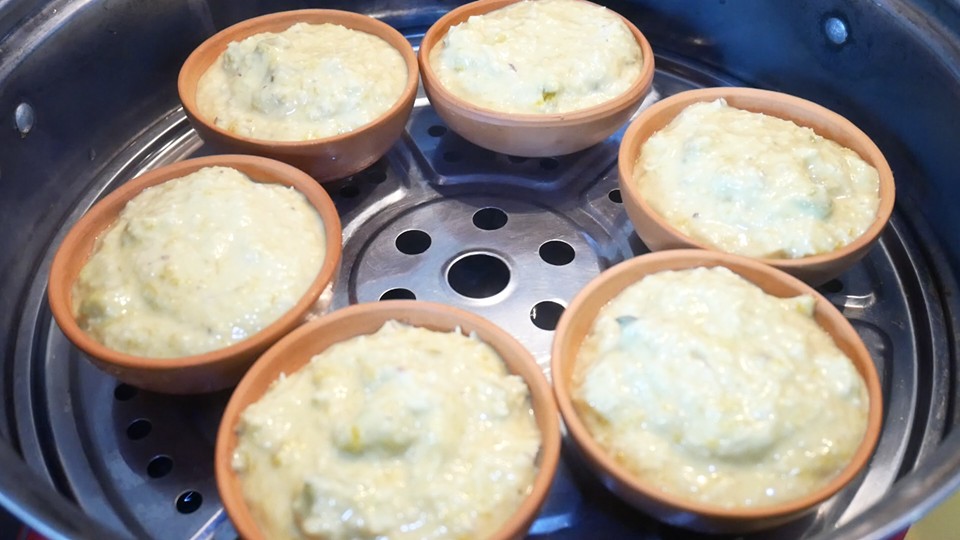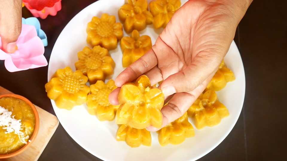 8. ตักใส่พิมพ์ที่ต้องการ และนำไปนึ่งประมาณ 15 นาทีหรือจนกว่าจะสุ ก