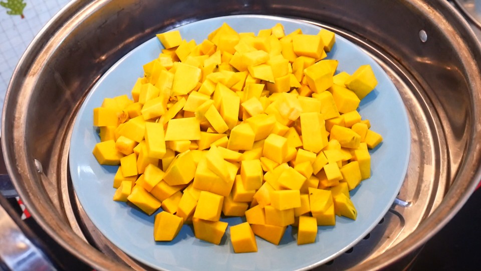 1. ปอกเปลือกฟั กทอง ล้าง และ หั่ นเป็นชิ้ นเล็กๆ และนำไปนึ่งให้สุ กประมาณ 10 นาที