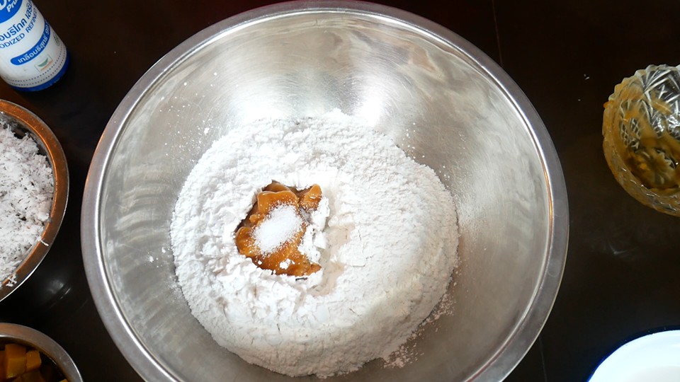 2. หลังจากนั้นเตรียมในส่วนของแป้ง โดยนำแป้งข้าวเหนียว แป้งข้าวเจ้า แป้งมัน น้ำตาลมะพร้าว เกลือ ผสมเข้าด้วยกัน
