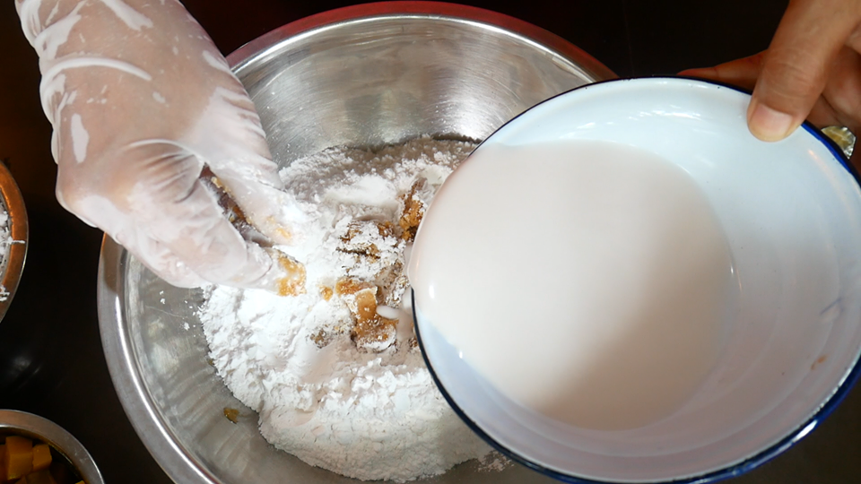5. หลังจากนั้น ค่อยๆ ทยอยใส่หัวกะทิ สลับกับการนวดให้เข้ากัน