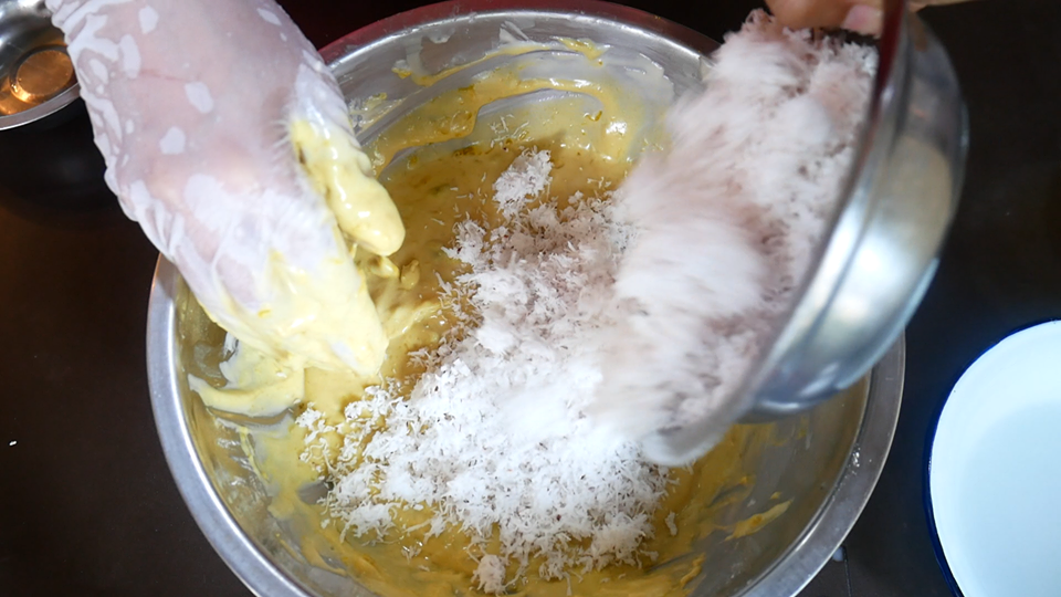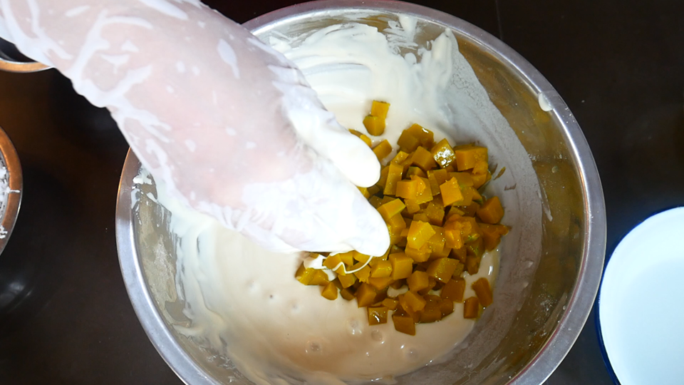 7. บี บนวดฟั กทองให้เข้ากันกับแป้ง หลังจากนั้น ใส่มะพร้าวขู ดขาว แล้วผสมให้เข้ากัน