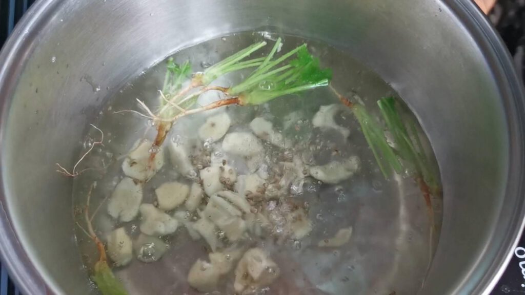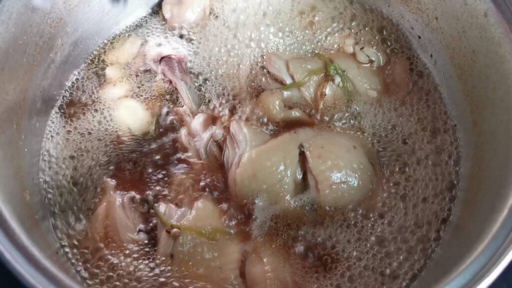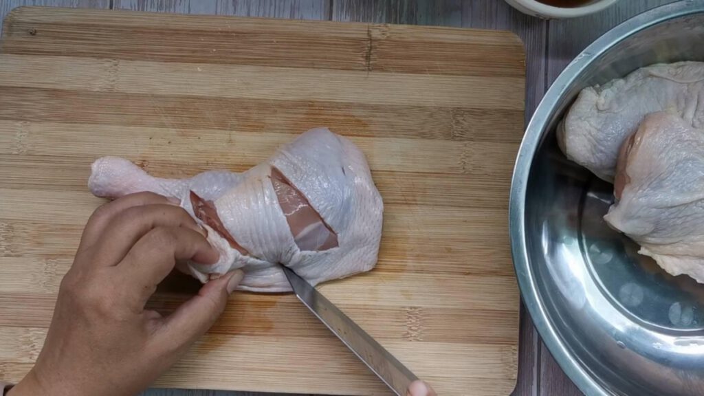 1.นำน่องติดสะโพกทั้ง 3 ชิ้นมาล้างทำความสะอาด จากนั้นนำมาบั้ง เตรียมตั้งน้ำกะให้พอท่ ว มๆไก่