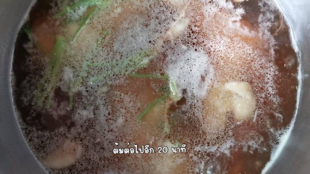 4.ตามด้วย น้ำป ล า น้ำตาลมะพร้าว และซีอิ้วดำ ใช้เวลาต้มประมาณ 20 นาที
