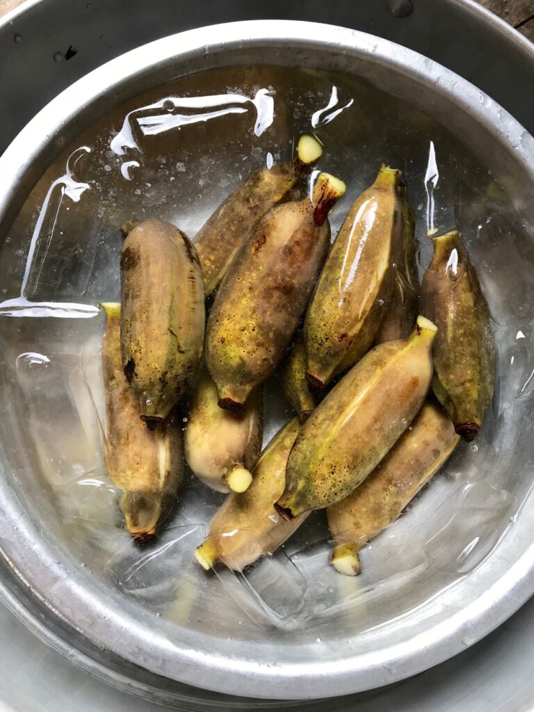 4.ระหว่างที่รอ ก็จะมาเตรียม น้ำเย็นจัด พอกล้วยได้ที่ก็ตักใส่กะละมังน้ำเย็น