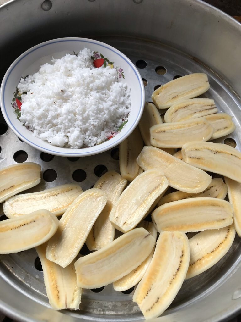 5.รอกล้วยเย็น แล้วก็ปอกเปลือก และ หั่ น ตามชอบค่ะ มะพร้าวขู ด เอามานึ่งด้วย เพื่อยืดอายุมะพร้าวค่ะ