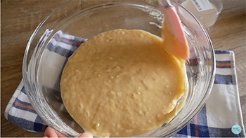 5. เทส่วนผสมเปียกลงในช ามที่ร่อนส่วนผสมแห้งเตรียมไว้ ผสมให้เข้ากันและพักแป้งเป็นเวลา 15 นาทีให้ผงฟูทำงานค่ะ