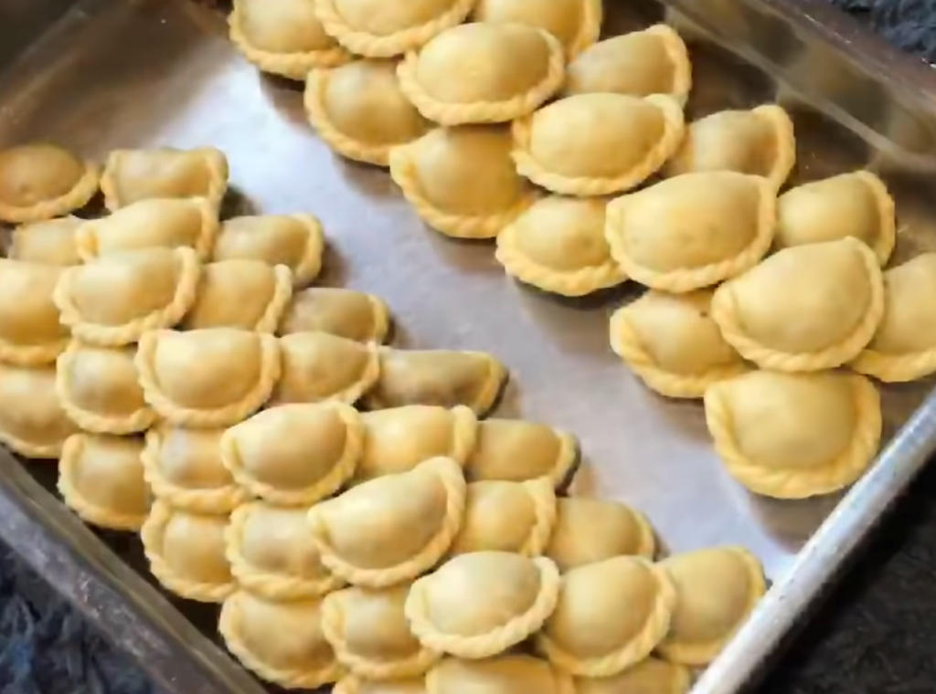 2. แบ่งแป้งออกมาปั้นเป็นก้อนเล็กกลม รีดแป้งให้เป็นแผ่นกลมแบนและบาง ใส่ไ ส้ลงไปตรงกลางแผ่นแป้ง