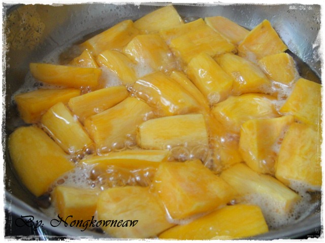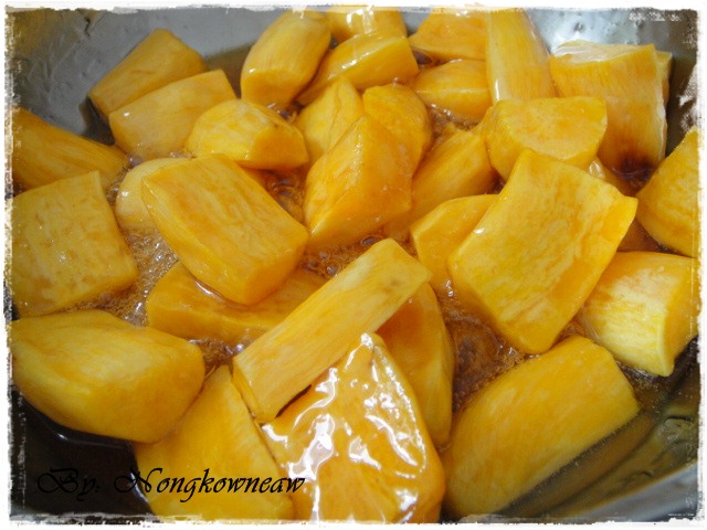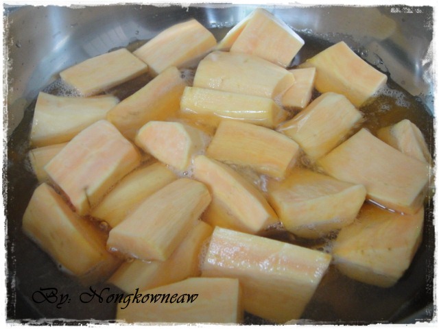 7.ตั้งหม้อหรือกระทะทองเหลืองให้ร้ อ นอีกครั้ง นำน้ำเชื่อมใส่ลงไป ตามด้วยมันเทศที่เราแช่น้ำปูใส