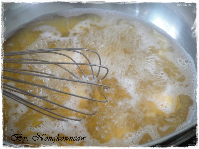2.เริ่มที่ตั้งหม้อเชื่อมหรือกระทะทองเหลือง ให้ร้ อ นใส่น้ำเปล่าลงไป ตามด้วยน้ำตาลปี๊บ