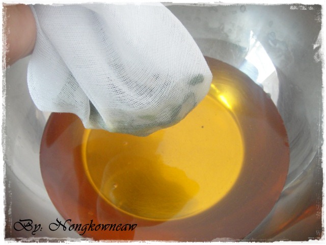 5.นำน้ำเชื่อมที่ได้ที่แล้วมากรองกับผ้าขาวบาง ก็จะได้น้ำเชื่อมหน้าต าแบบนี้ค่ะ