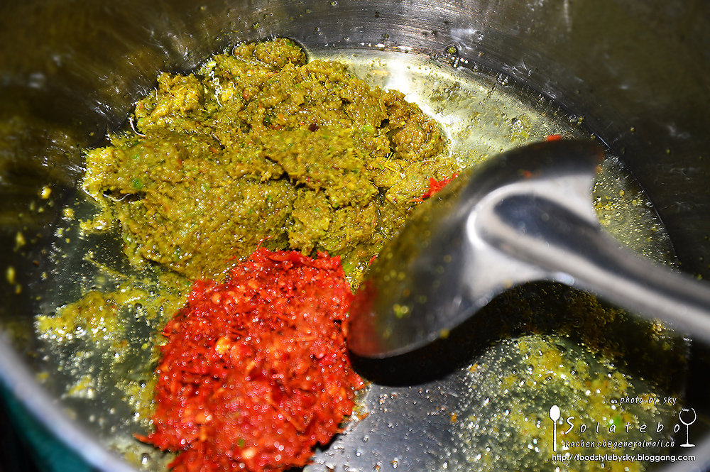1.ตั้งหม้อ ใส่น้ำมัน เล็กน้อย ใส่พริกแกงลงไปผัดใช้ไ ฟอ่อน ผัดให้หอม