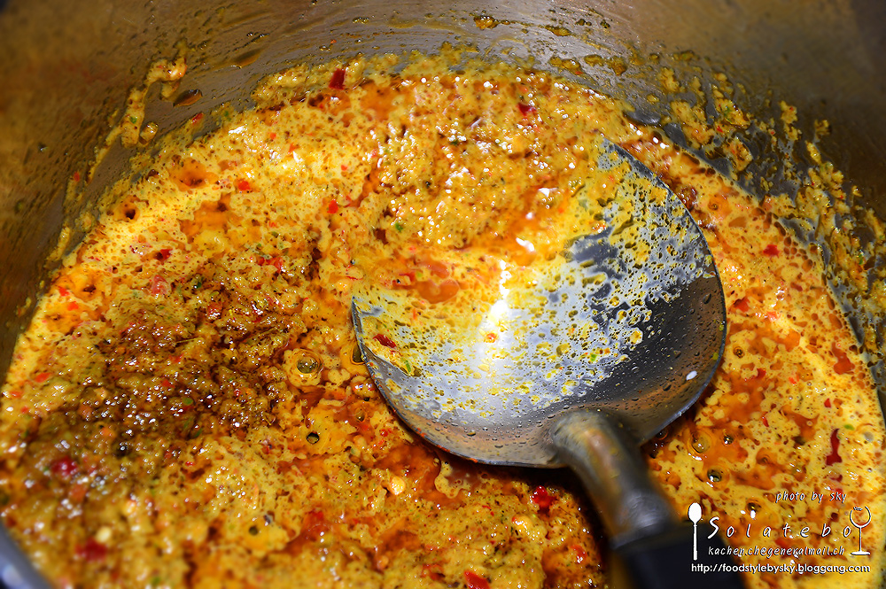 2.ระหว่างผัด ก็เติมหัวกะทิ ลงไปทีละทั พพี เคี่ยว ให้แตกมัน ใส่สักสองทั พพี