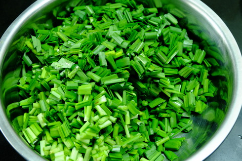 3.หั่ นตรงโคนออกนิดหน่อย แล้วหั่นกว้างสักประมาณ 10 มม. ไม่จำเป้นต้องตัดปลายออกเหมือนต้นหอม
