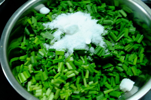 4.เตรียมเกลือ น้ำตาล เบคกิ้งโซดา และน้ำมัน ใส่ลงไปที่ใบกุ้ยช่ายได้เลยขั้นตอนนี้ก็นวดๆๆๆ ขยำให้ใบสลดนิ่ม