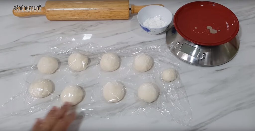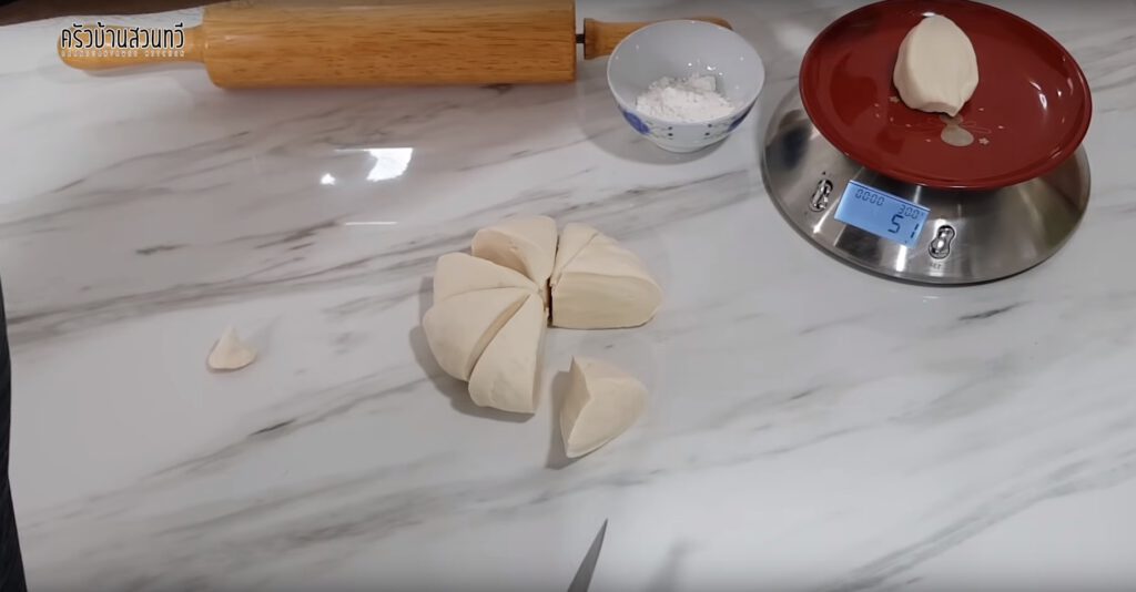 4. นำแป้งออกมาตัดแบ่งเป็นก้อน ก้อนละ 50 กรัม หรือว่าตามขนาดที่เราต้องการ