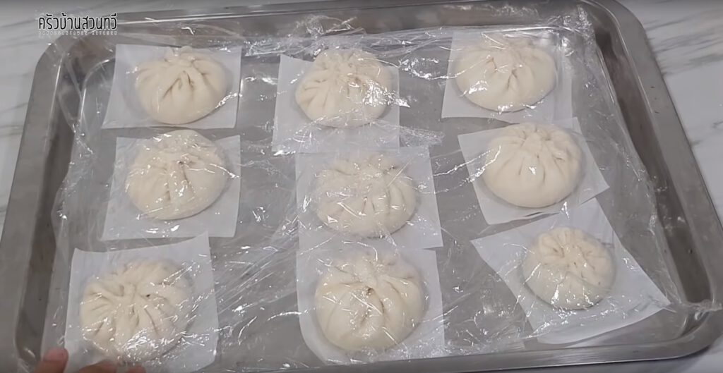 7. จับแป้งซาลาเปาจีบ แล้วนำแป้งวางบนกระดาษ ทำทั้งหมดจนหมดแป้ง แล้วนำแป้งซาลาเปาพักไว้ให้ขึ้นฟู 2 เท่า