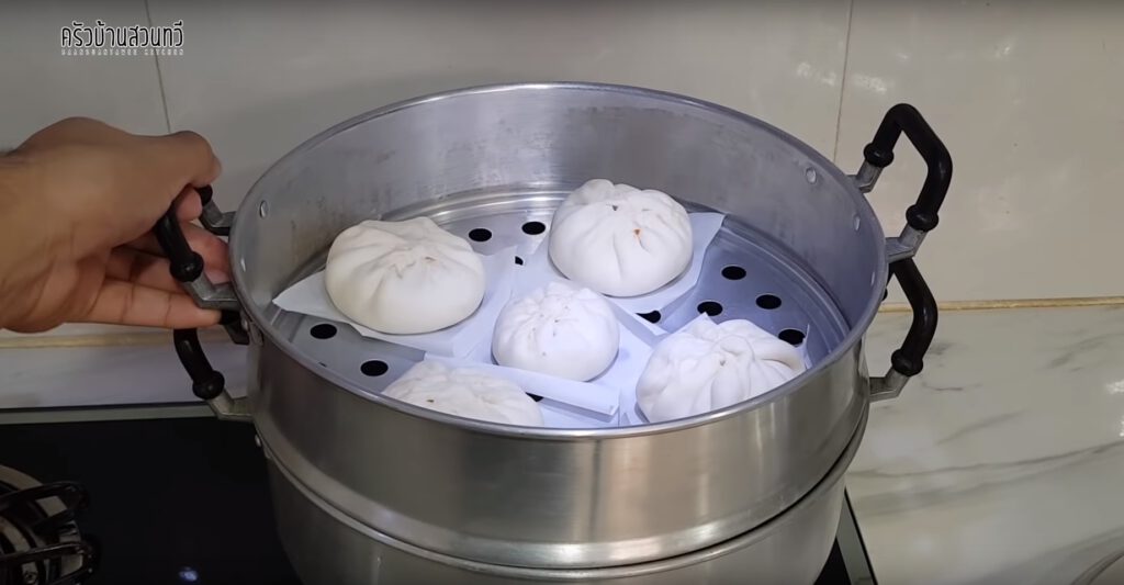 8. ตั้งซึ่งรอไว้ ให้น้ำเ ดื อ ดจัดๆ แล้วนำซาลาเปาที่พักไว้จนขึ้นเป็นสองเท่าแล้ว