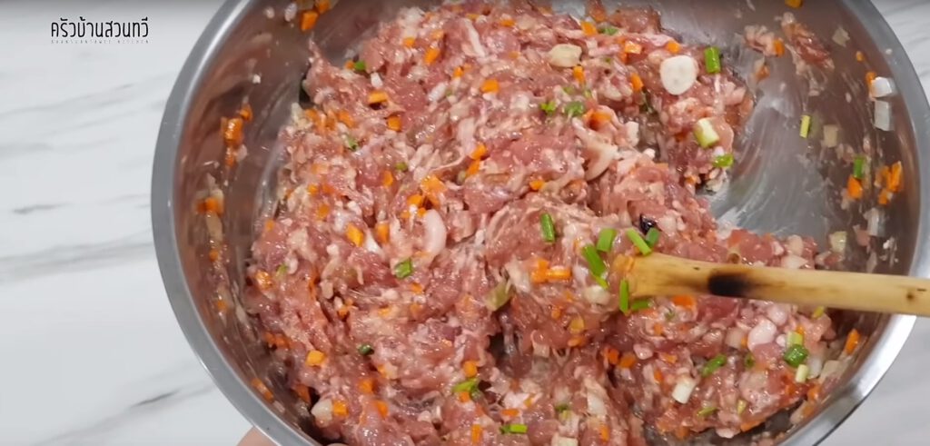 1. นำส่วนผสมทุกอย่ างผสมรวมกันจนเข้ากันดี แล้วพักไว้ในตู้เย็น 30 นาที