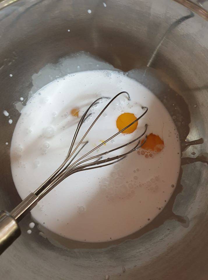 1.ให้นำส่วนผสมทั้งหมด มาเทรวมกันในอ่าง ผสมแสตนเลส แล้วใช้ตะกร้อมือ๓ีให้เข้ากัน