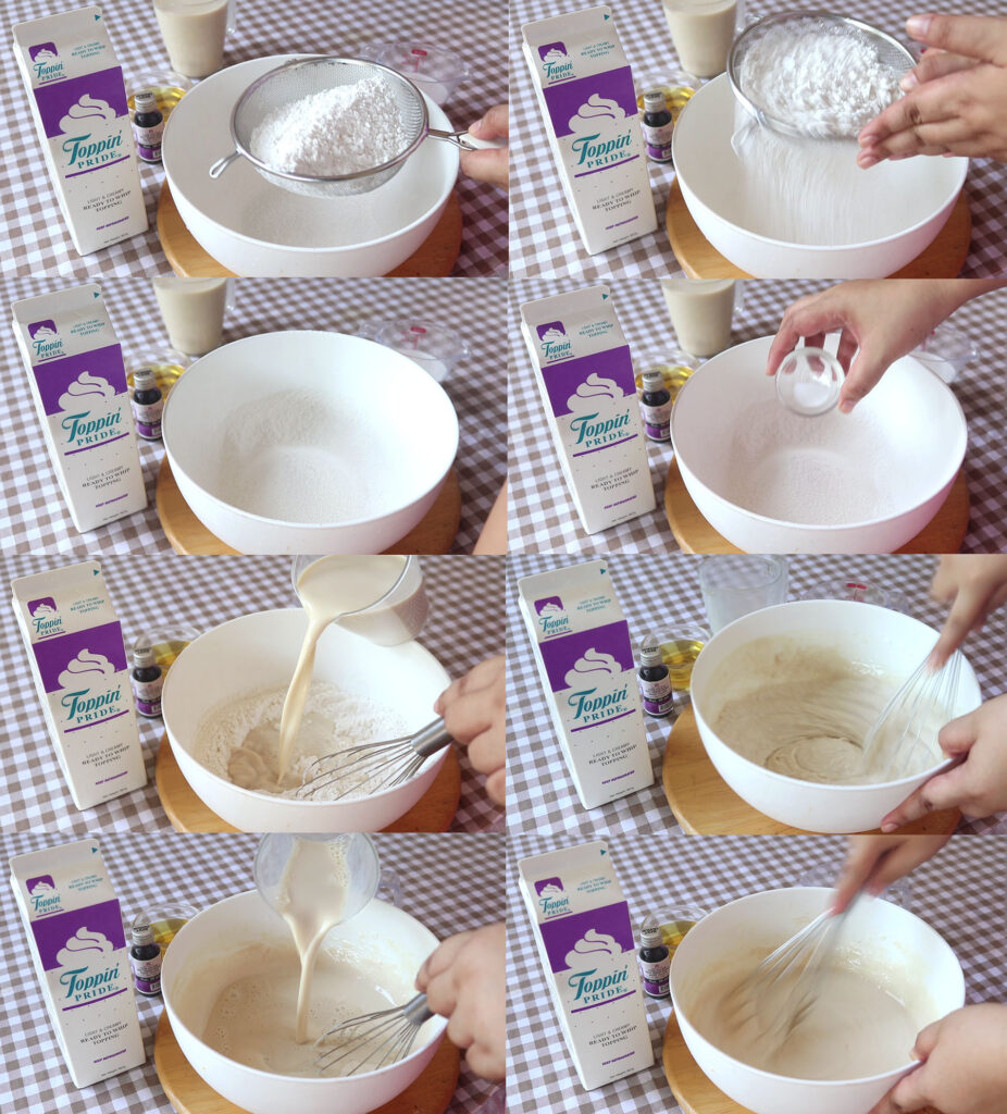 1.ร่อนแป้งเค้ก ใส่เกลือป่นลงไปในช ามผสม ตามด้วยน้ำเต้าหู้หรือนมถั่วเหลืองแบ่งเทลงไป 2-3 รอบ คนให้ส่วนผสมเข้ากัน