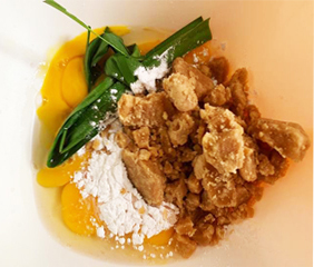 1. ต อกไข่ใส่ภาชนะ ตามด้วยเกลือ น้ำตาลปี๊บแป้งข้าวเจ้า และใบเตย จากนั้นขยำให้น้ำตาลปี๊บละลายดี และส่วนผสมเข้ากัน