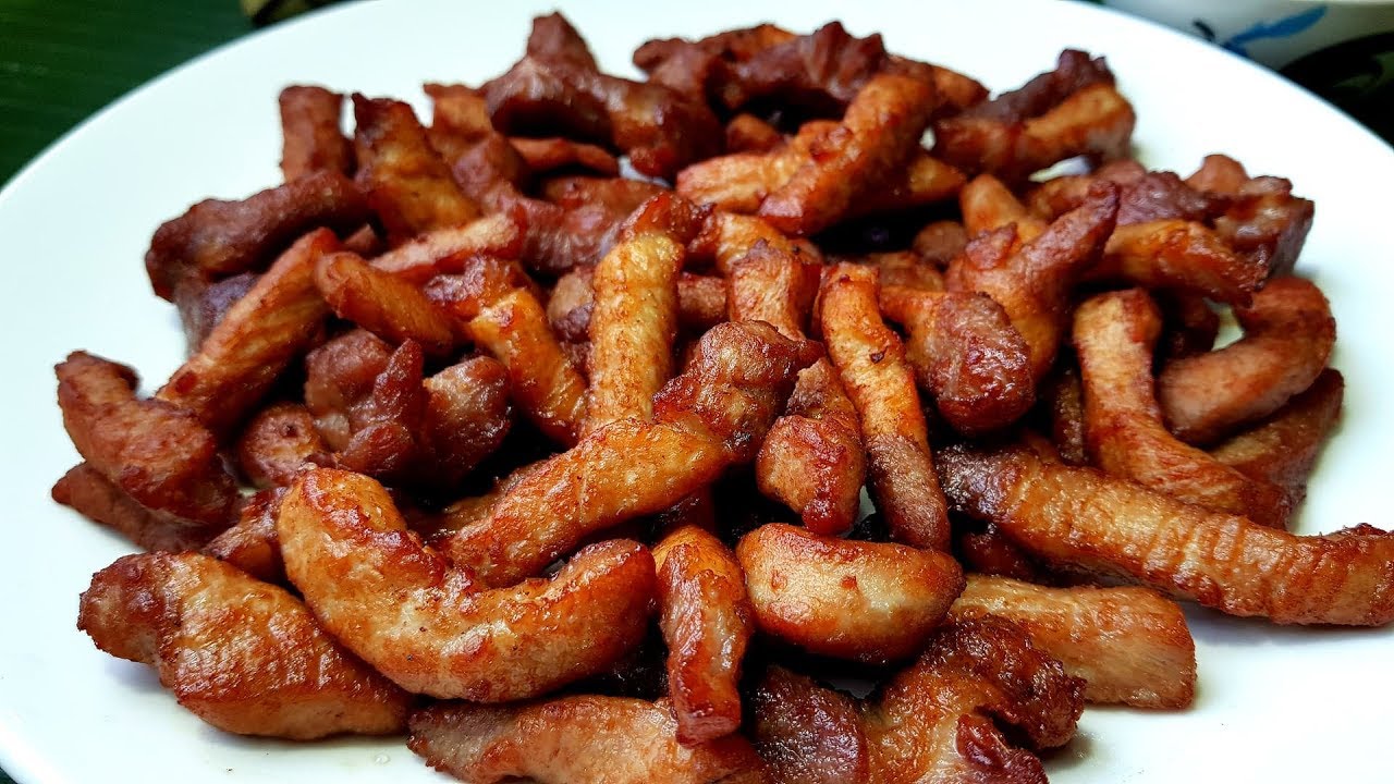 1.นำสั นคอหมูลงไปทอดในน้ำมัน โรยผงรสดีลงไปเล็กน้อย ทอดจนสุ ก