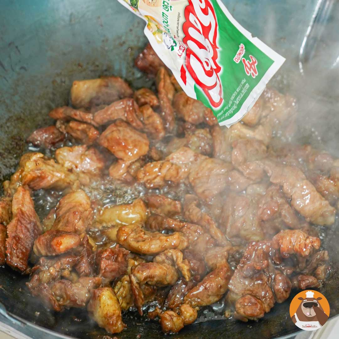 2.ปรุงรสด้วยน้ำมันหอย, ซีอิ๊วดำ, ซีอิ๊วขาว และน้ำตาลปี๊บ ผัดต่อไปเรื่อยๆ