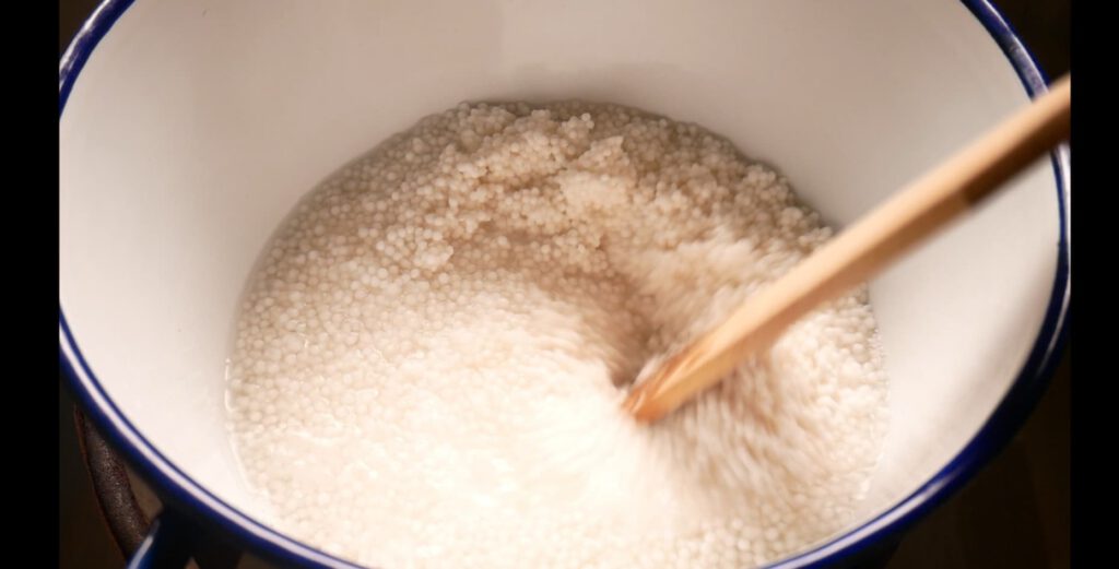 3. คนพอน้ำเริ่มแห้ง ให้ใส่น้ำใบเตยลงไปคนต่อทันทีจนสาคูสุ ก วิธีสังเกตุคือ ผิวรอบๆสาคูจะใส และมีต ากบขาวๆเล็กๆด้านใน