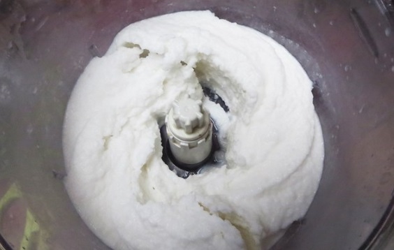 3 เมื่อไอศกรีมเริ่มจับตั ว แ ข็ งแล้ว ก็นำออกมาปั่ นในเครื่องปั่น ให้เนียนพร้อมกับใส่ไข่ขาวลงไปปั่นด้วย