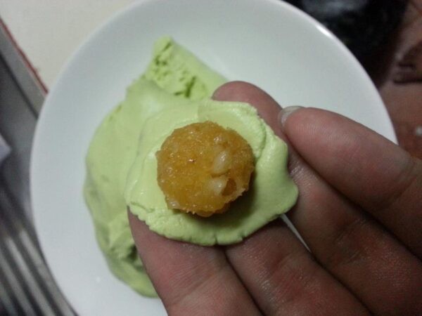 3. เตรียมทำส่วนของตัวแป้ง โดยผสมแป้งข้าวเหนียวกับน้ำเปล่าและน้ำใบเตยที่ละน้อย ลงในช ามใบใหญ่