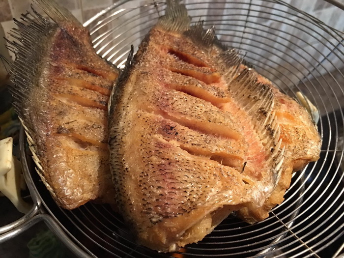 3. แล้วนำมาแกะออกจากก้ า ง เพื่อจะกลับไปทอดอีกครั้งให้เหลืองกรอบ