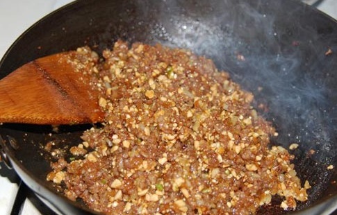 2.คั่ วถั่วลิสงแล้วคัดเอาเปลือกออก แล้วนำมาตำไม่ต้องละเอียดมากนัก