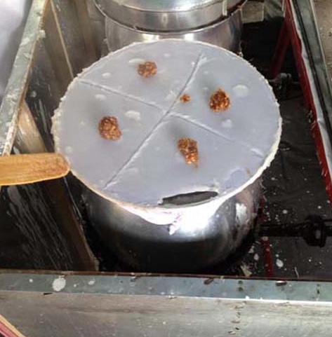 9.เมื่อแป้งสุ ก ให้เปิดฝาออกตักไ ส้หยอดลงไปตรงกลางแป้งพอสมควร ใช้ไม้พายเล็ก ๆ ชุบน้ำก่อน แซะแผ่นแป้งขึ้นมา