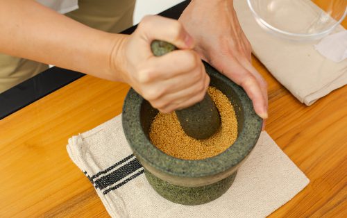 6.นำงาข าวคั่ วใส่ครกบุ บพอแ ต ก ผสมกับน้ำต าลทราย พักไว้