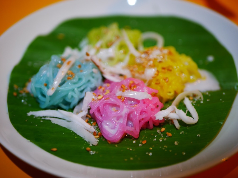 แบ่งส่วนผสมเป็นสามส่วน ส่วนแรกทิ้งให้เป็นสีข าว ส่วนที่สองผสมน้ำใบเตย และส่วนสุดท้ายผสมน้ำอัญชัน