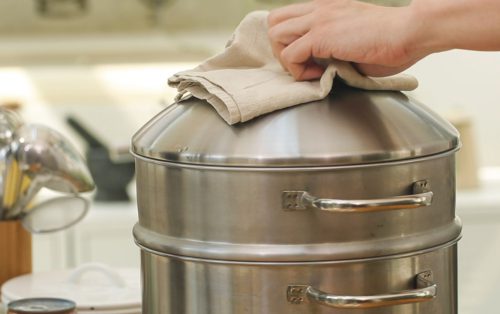 แล้วจัดเรียงลงในลังถึงที่รองด้วยผ้าข าวบาง ทำซ้ำจนหมด