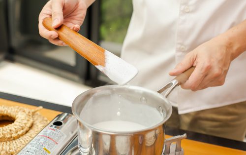 5.เตรียมน้ำกะทิหยอดหน้า โดยนำกะทิ น้ำสะอาด เกลือ และแป้งข้าวเจ้าใส่หม้อตั้งไ ฟ คนให้สุ กและข้นดี พักให้เย็นลง