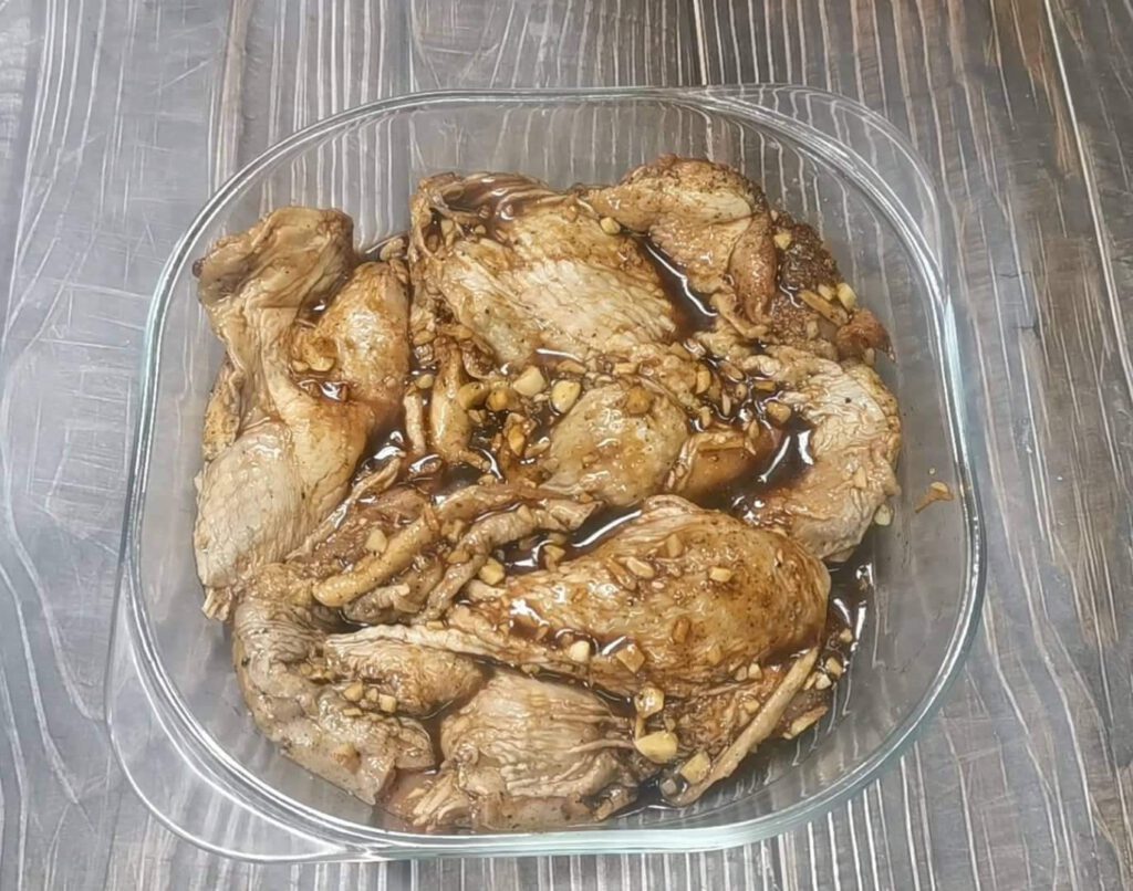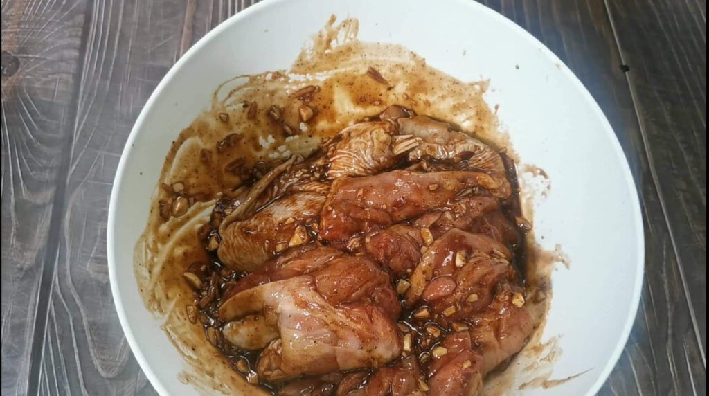 1. ผสมเครื่องปรุงทั้งหมดให้เข้ากันนำไก่ ลงไปหมัก ใส่กล่องปิดฝา หรือปิดพลาสติกแรป เก็บเข้าตู้เย็นทิ้งไว้ข้ามคืน