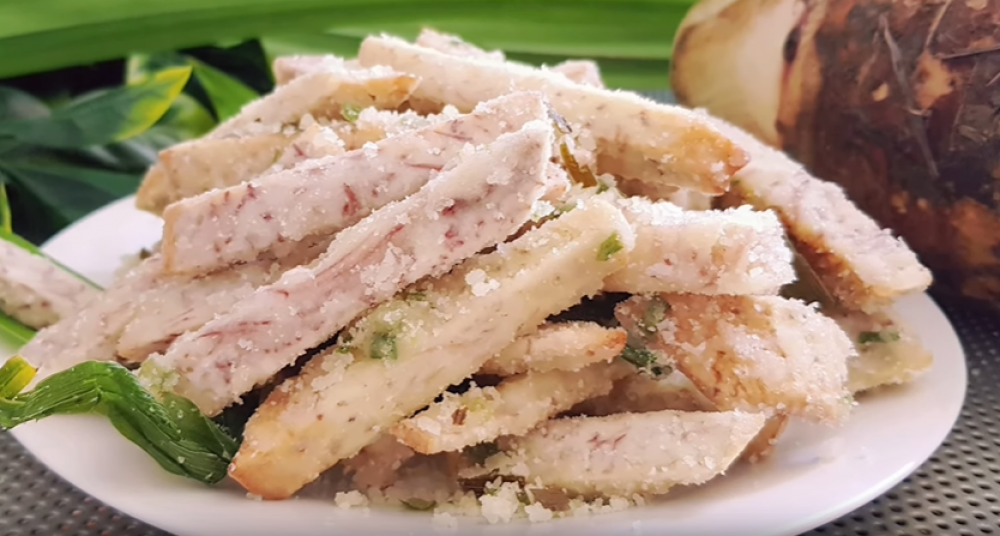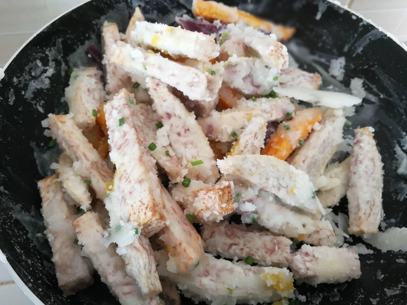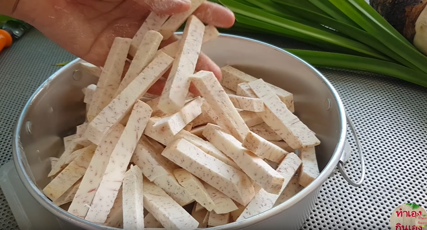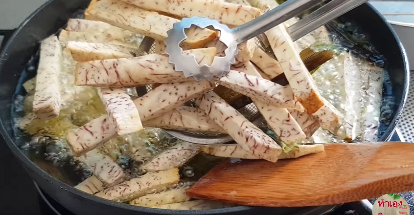 2. น้ำมันปาล์ม ต้องท่วมเ ผื อ ก รอให้น้ำมันร้ อ นจัด ใส่ใบเตยลงไป ด้วยเพื่อความหอม ใส่เ ผื อ ก ลงไป ระยะเวลาประมาณ