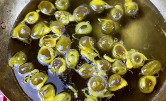 5 นำเผื0กที่เราปั้นเอาไว้เป็นลูกๆ ชุบไ ข่ แ ด งที่เราเตรียมเอาไว้ จากนั้นให้เราค่อยๆหยอดลงไปในน้ำเชื่0มที่เดื0ดเบาๆ