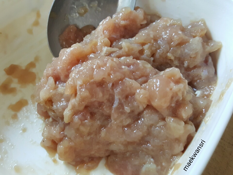 2. นำส่วนผสม(ข้อ1)ไปผสมกับไก่(หมู)สั บ ปรุงรสด้วยน้ำมัuหoย/ซีอิ๊วข า ว/น้ำมัu ง า/น้ำต าล/แป้งมัu นวดให้เข้ากัน