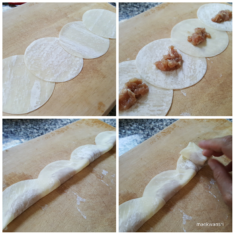 3.นำไก่(หมู)สั บที่หมักได้ที่แล้วมาห่อกับแผ่นเกี๊ยว