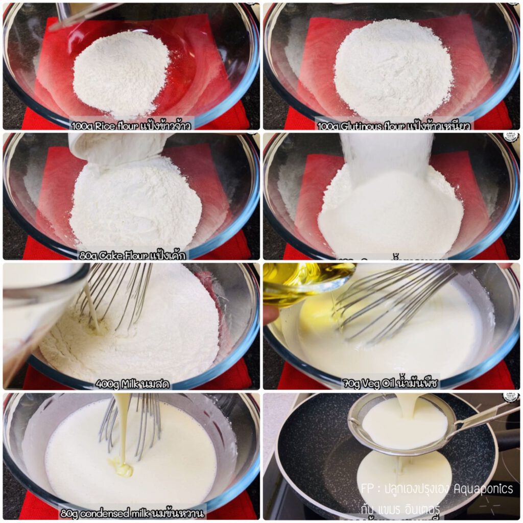 1.เทส่วนผสมของแป้งข้าวเจ้า, แป้งข้าวเหนียว, แป้งเค้กและน้ำตาล คนส่วนผสมทุกอย่ างให้เข้ากัน