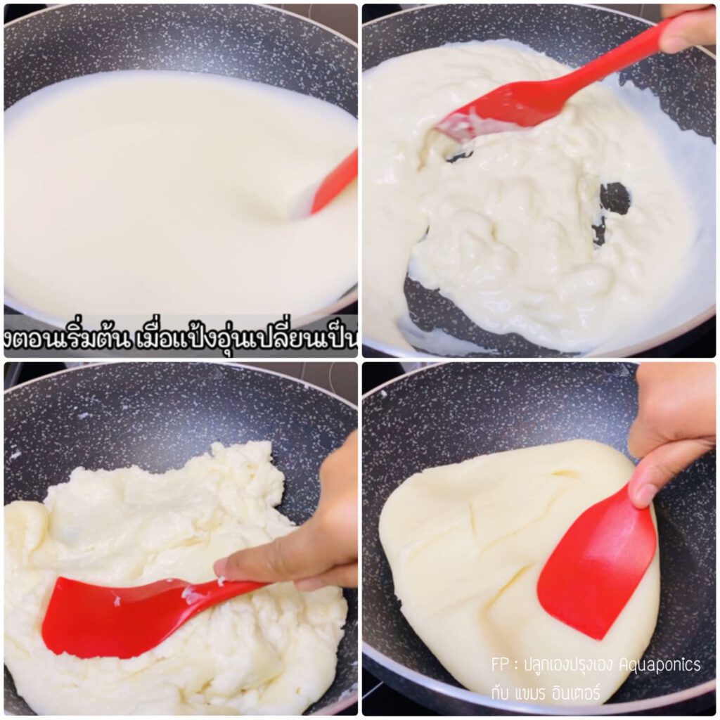 2.เริ่มต้นจากไ ฟกลาง พอแป้งเริ่มเป็นลิ่ มสลับมาที่ไ ฟกลางค่อนอ่อนและคนตลอดเวลาจนกระทั่งเ นื้ อแป้งสุ ก