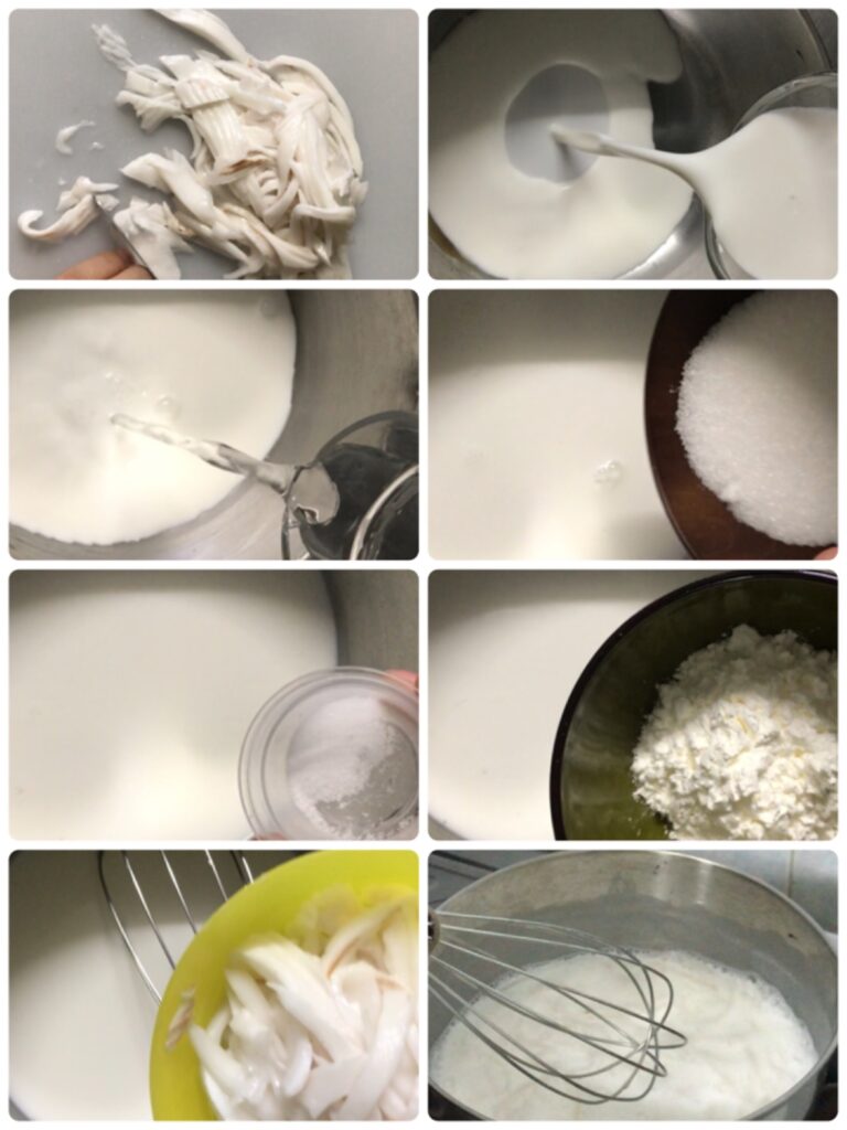 1. นำส่วนผสมทุกอย่ างรวมกัน ตั้งไ ฟกลาง กวนให้เข้ากัน จนข้นเป็นครีม เห็นเป็นรอยตะกร้อก็หยุด พักไว้ให้เย็uตัวลง