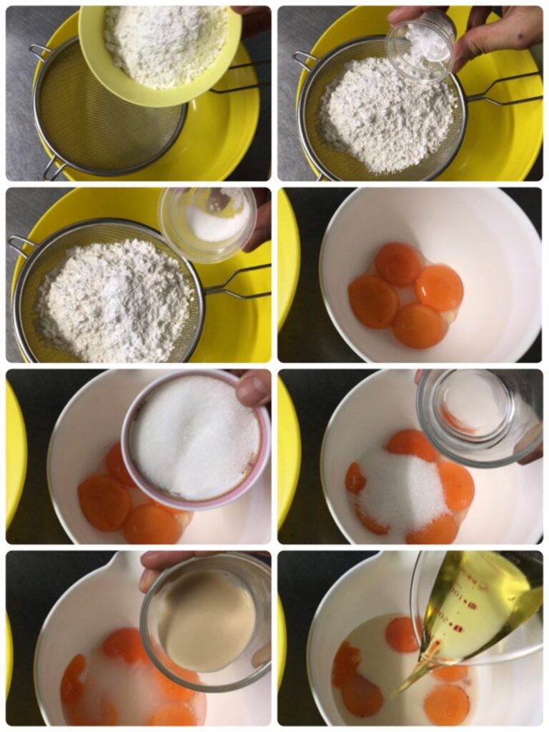 1. ร่อนแป้ง ผงฟูรวมกัน แล้วใส่เกลือคนให้เข้ากัน