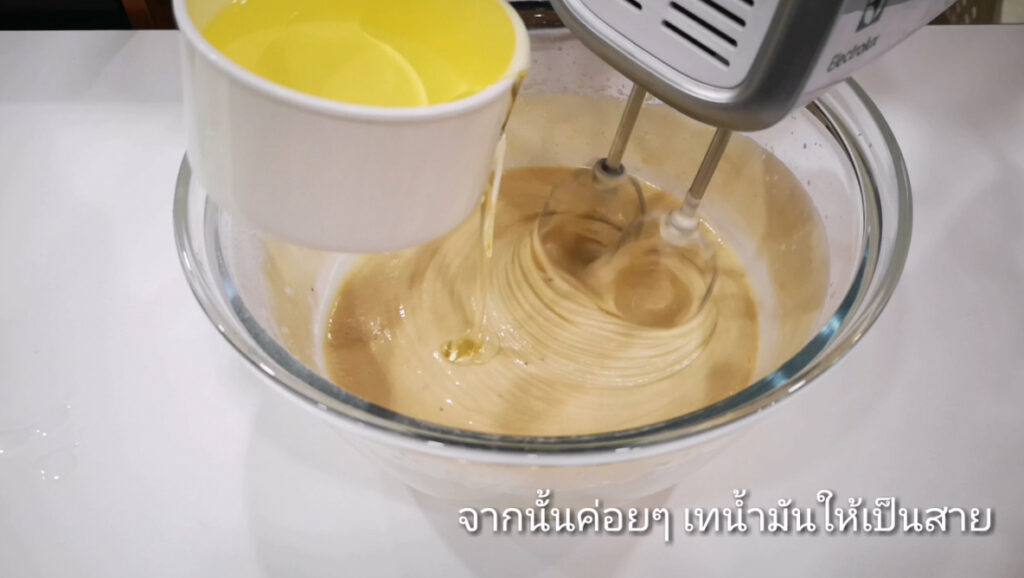 -ส่วนผสมสุดท้ายคือน้ำมันพืชในคลิปใช้น้ำมันคาโนล่ า ค่อยๆ หยอดให้เป็นสายจนหมด เช่นเดียวกัน