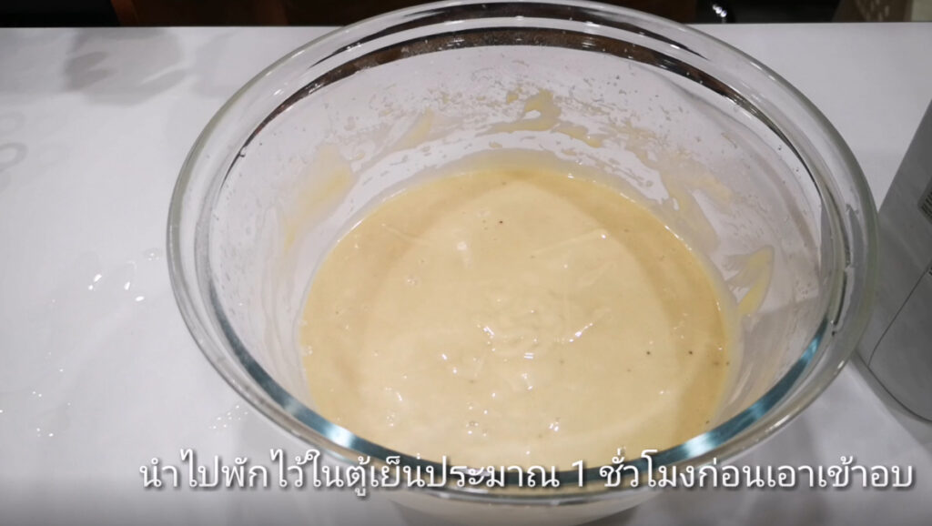 -เมื่อส่วนผสมเข้ากันดีแล้วให้นำไปพักไว้ในตู้เย็นประมาณ 1 ชั่วโมง หรือจะทิ้งไว้ค้างคืนก็ได้