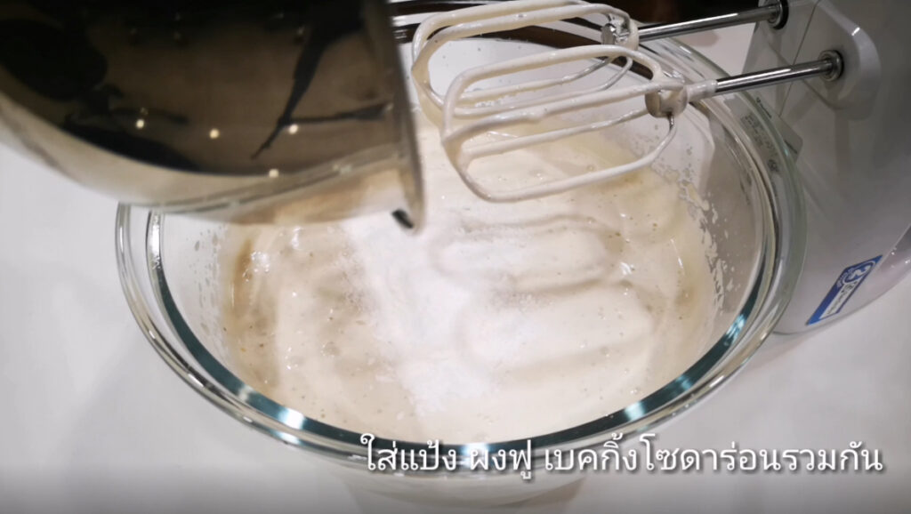 -หลังจากนั้นค่อยๆ ใส่แป้ง ผงฟู เบคกิ้งโซดา (ร่อนรวมกันไว้)
